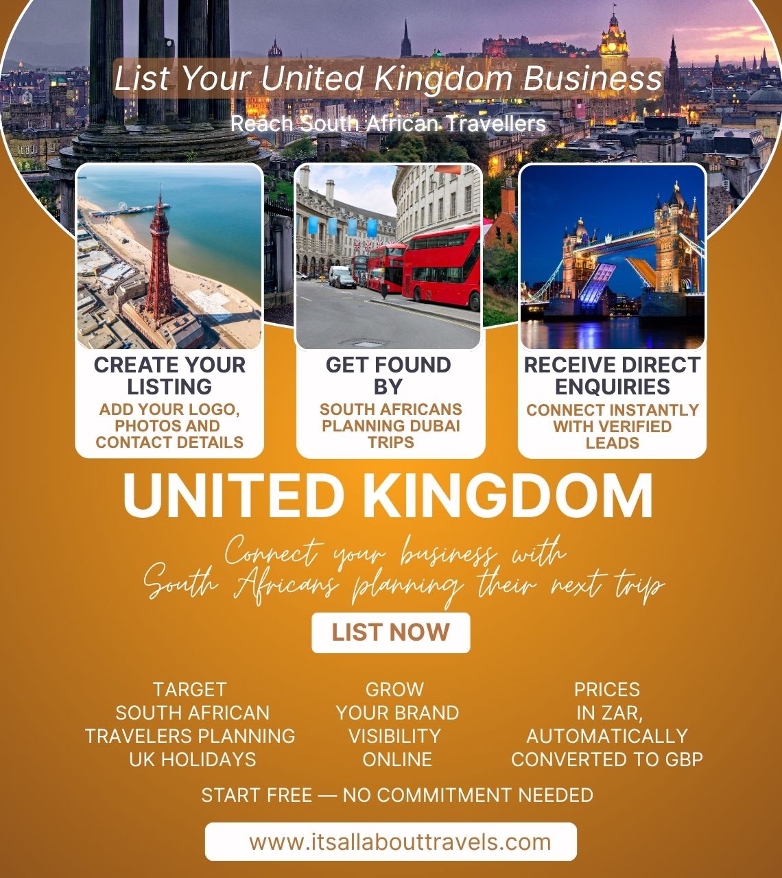 UK travel businesses — promote your tours, packages, and experiences to travellers exploring South Africa. Start free and get discovered today.